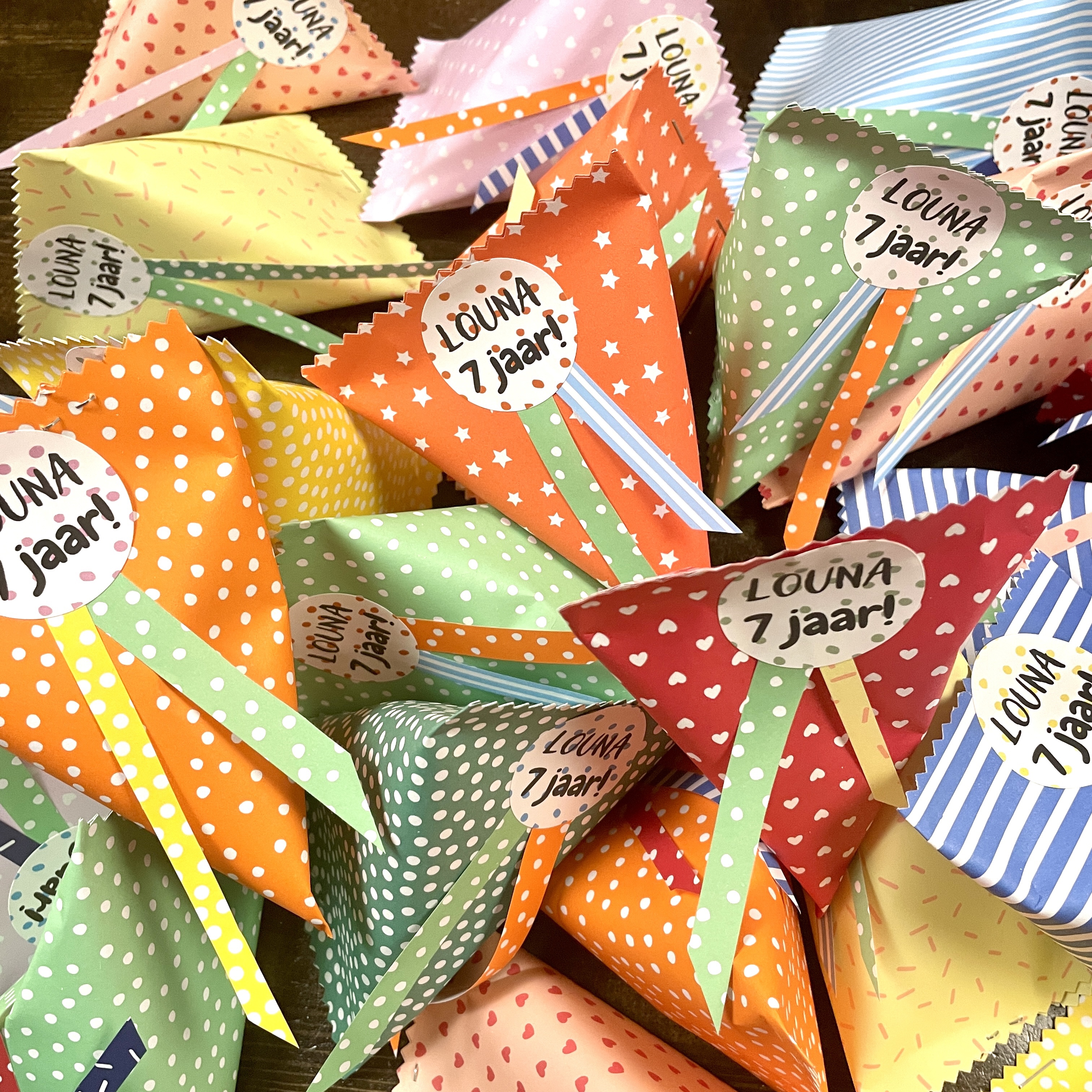 Een traktatie met gewoon wat snoepjes in een zakje is op zich niet heel bijzonder, maar in deze zakjes is het toch wel een vrolijk en kleurrijk geheel. Blij mee! Dochter ook trouwens. We vulden de zakjes natuurlijk samen, ook altijd weer gezellig!