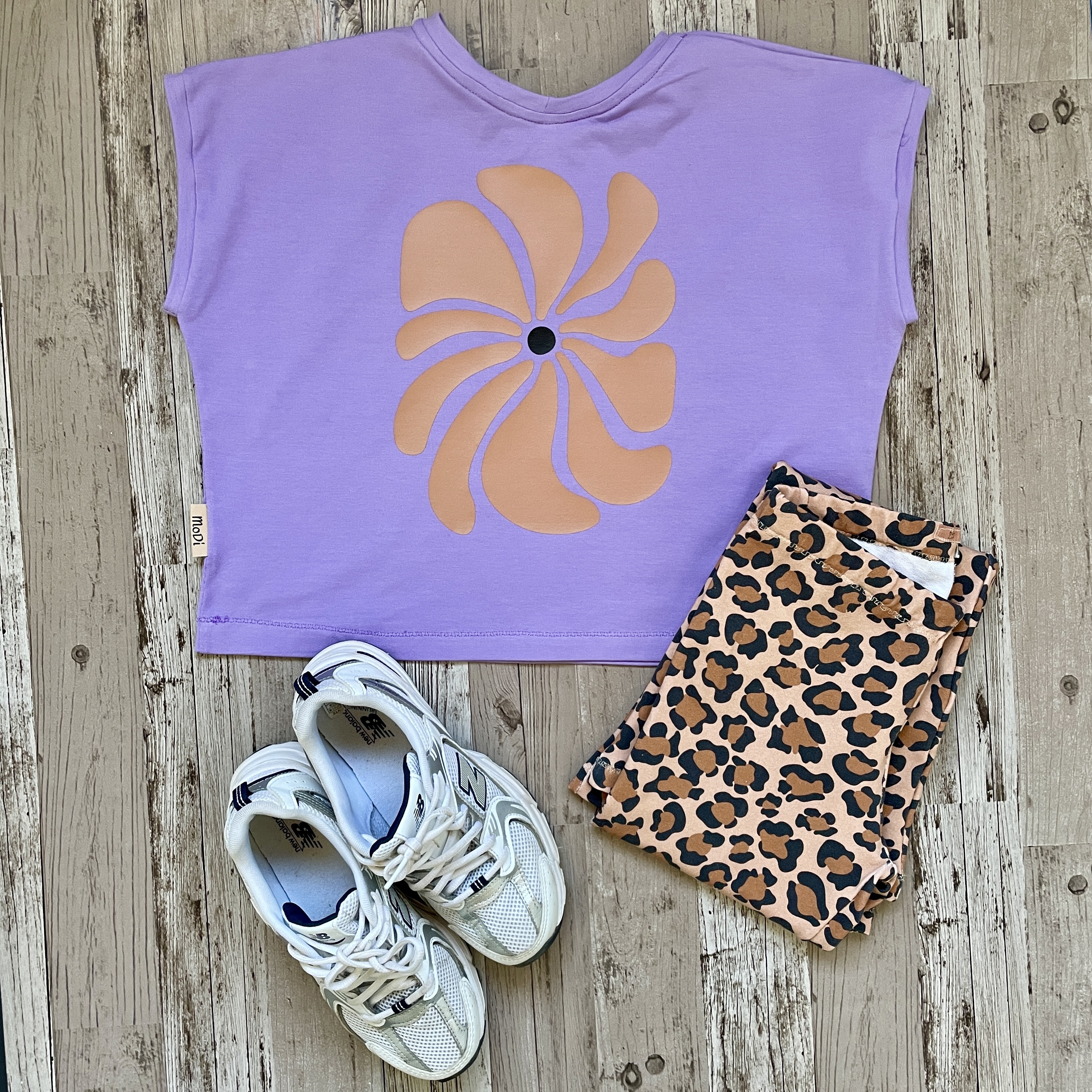 De panterprint (french terry) vond ik in de sale bij Rebelstudio. Het leek mij mooi om dit met roze te combineren, maar mijn oudste dochter is niet meer zo van het roze en wilde er daarom geen roze shirt bij hebben. Panterprint en roze vind ik een hele toffe combi, maar daarom stelde ik voor om voor lila te gaan. Dit staat ook super leuk. Dat vond ze wel een goed plan. Deze lila tricot vond ik bij Megastoffen. 1 meter kost hier maar € 5 (als je er minimaal 2 besteld).