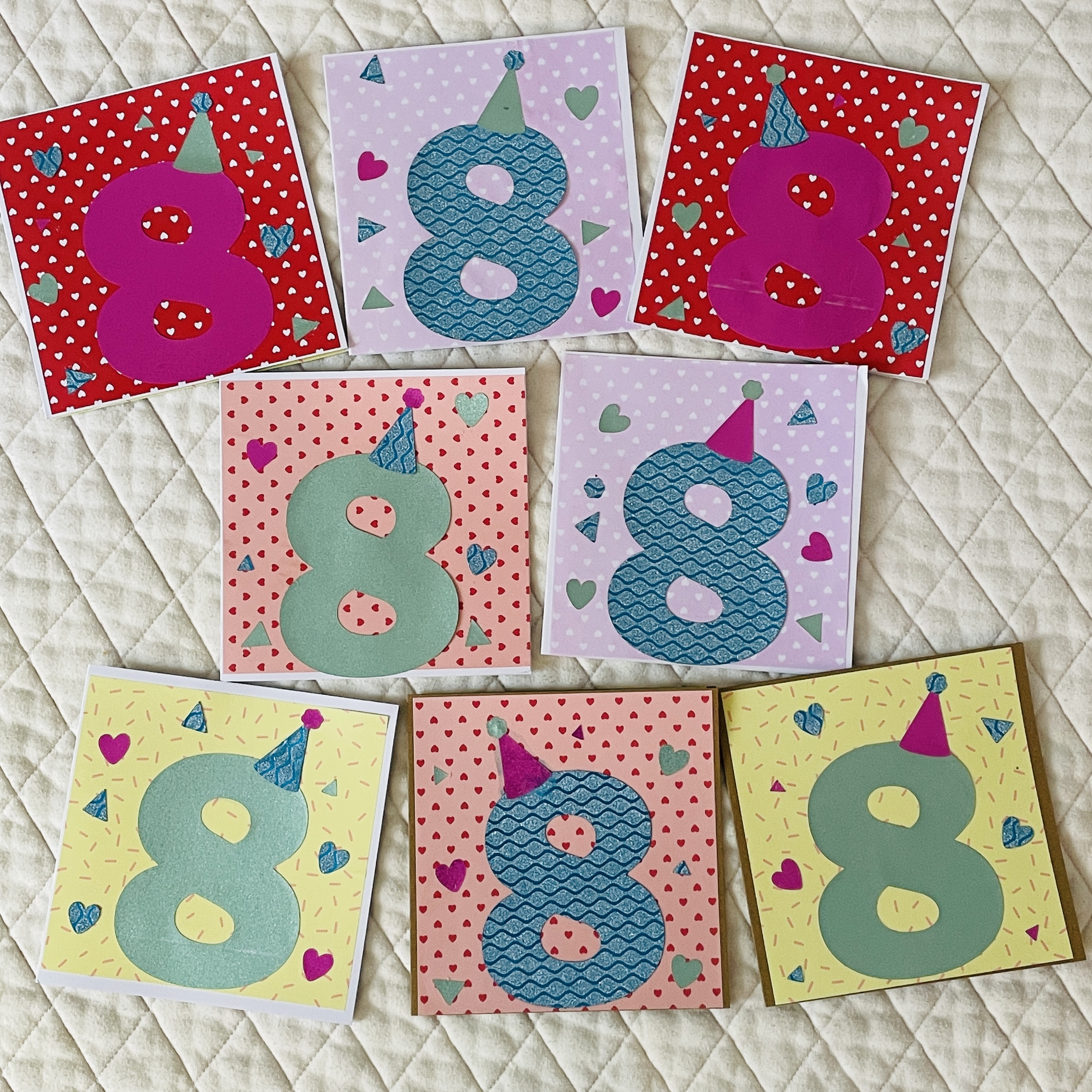 Ik ging eerst met mijn Cameo Silhouette aan de slag. Hiermee sneed ik wat vormen uit: het cijfer 8 in verschillende kleuren, hartjes, driehoekjes en feesthoedjes. Dit maakte het project een stuk makkelijker, maar met een beetje geduld kun je natuurlijk ook prima dit soort figuren uitknippen met een schaar.